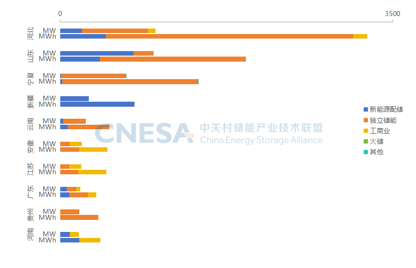 电源侧,新增装机规模1.83GW/4.09GWh,功率规模较去年同期下降31%,占比较去年同期下降16个百分点,均为新能源配储项目,分布在山东、新疆、河北、甘肃、河南等15省,其中,山东新增投运功率规模占比42%,居全国首位。