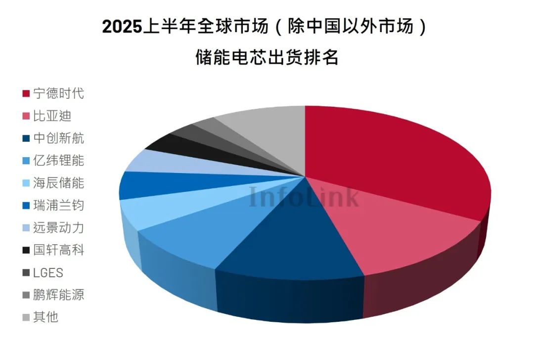 2025 上半年度,海外市场电芯出货 108.98 GWh,占全市场的比重接近 45%。海外市场储能电芯出货 Top3 厂商为宁德时代、比亚迪、中创新航。目前,中资厂商海外电芯出货大多是通过中资头部系统集成商海外储能项目投运实现。韩系厂商中,LGES 位列第九,预计其海外市场占有率将逐步回升。