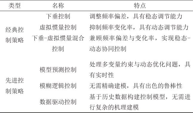 设计恰当的控制策略对于保障超级电容在调频过程中精准出力至关重要,现有的控制策略大致可以分为两类:经典控制策略和先进控制策略。经典控制策略主要包括下垂控制、虚拟惯量控制,以及基于二者的混合控制。先进控制策略主要包括模型预测控制(model predictive control, MPC)、模糊逻辑控制(fuzzy logic control, FLC)和数据驱动控制等。超级电容的调频控制策略汇总如表2所示。